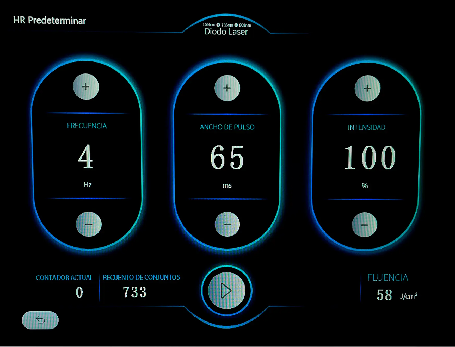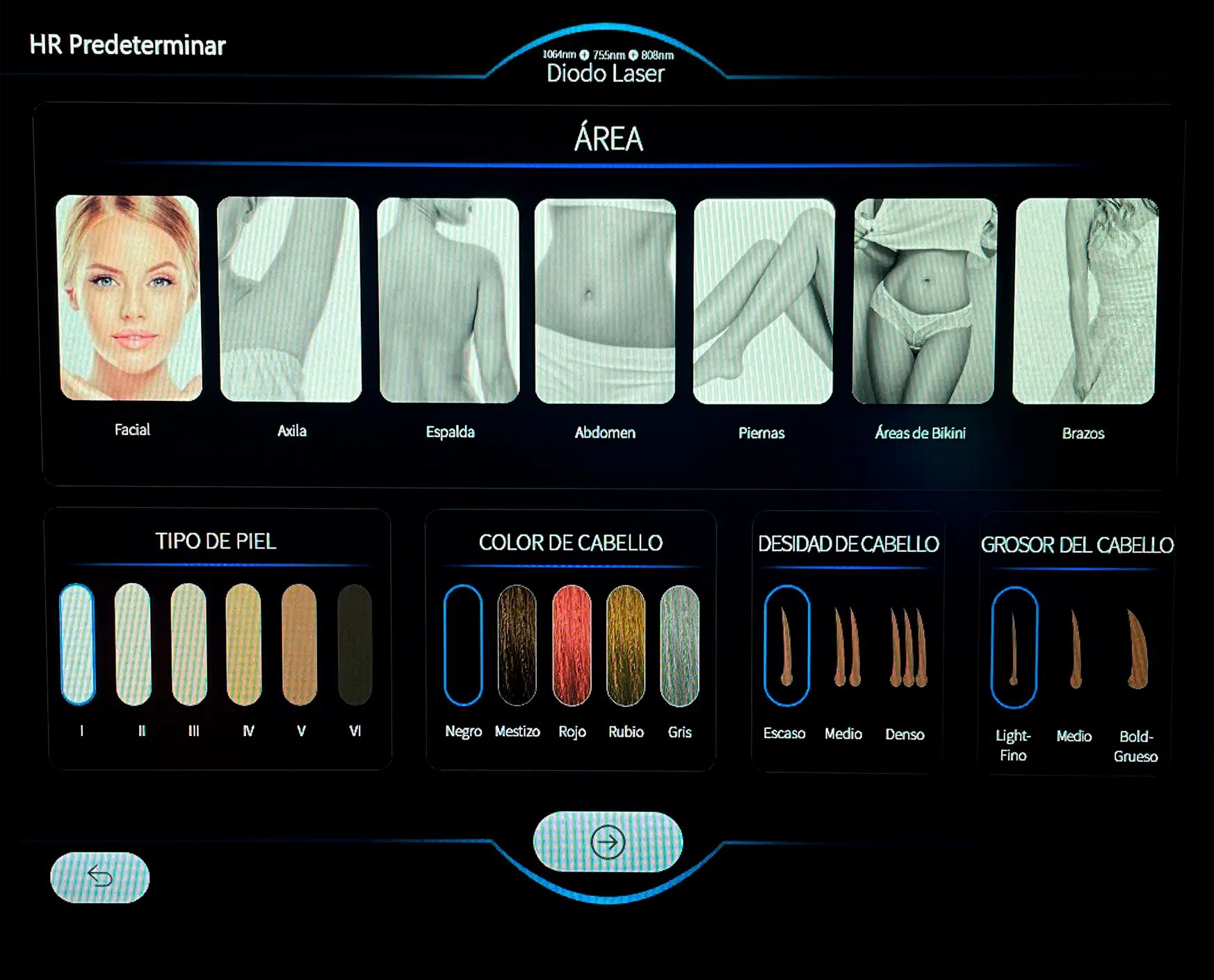 Su interfaz intuitiva te permite personalizar cada tratamiento según tus necesidades, seleccionando la zona a tratar, el fototipo de piel, el color y grosor del vello, así como su densidad, garantizando resultados efectivos y seguros.